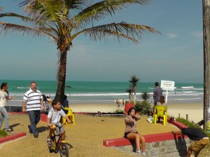 So after I suited up, I followed the procession onto, up, and across the boulders to the slippery patch of rocks at the end which was the designated take off point. I lurked right next to that spot a long time, inviting many surfers to go before me so I could get a sense of how the waves were breaking here, and so I could observe exactly how they did it. A couple guys gave me some advice in Portuguese, which I fear I only half gathered –something about watching out for the slippery portions of the rock and gripping on the mussel shells – but that was useful. It was all in the timing, making sure that a big set was not coming in to cheese-grate you across the barnacles. Then you just hopped off and paddled quickly to clear the other boulders that surrounded you. “If all these people can do it, I can do it,” I told myself. And when I felt ready, I hopped in. I’m not gonna lie, I paddled like hell to clear those boulders, and judging by the amused smiles that greeted me when I reached the line-up, I may have had a look of terror on my face. The southward current quickly helped me get out of the way of the hardcore shredders, and I caught some pretty glorious waves that Mole that day. And when I rode a really nice left, all the way into the beach, I did what I saw everyone else do, and I got out and ran through the sand back to the headlands. A great introductory day into the world of launching off rocky headlands on my board. Many firsts here in Brazil!