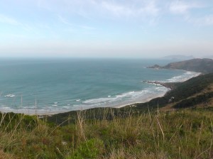 myself used to the idea that this board would probably suffer a lot of abuse during my trip. No prima-dona boards for me, only rough and ready pirate adventurer surfboards. Appropriately, my board has a pirate printed on the nose! But pretty soon, my surfboard and I were rewarded for our efforts, when we emerged onto a magestic grasscovered ridge trail, high up above the town, and oh what views!
