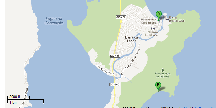 map screen shot Published August 17, 2012 at 706 × 353 in Through the jungle, over the mountain, to the beach This map shows Barra da Lagoa (A) and Praia da Galheta (B). The big body of water to the west is actually a lake, Lagoa Conceicao.