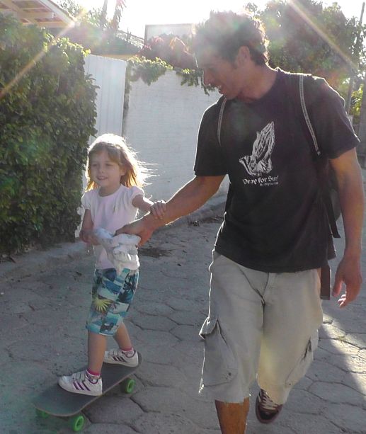 Yesterday I went to her lovely house in a small town in the southern part of the island.  Her husband, Zazo (also a surfer), grew up on the street where they currently live, although he told me that when he was little there was no street and the whole thing was a forest.  They have two kids, Caio and Elis, who are wondrous.  Elis (age 4) likes to spend her time scaling the wall of the living room, standing atop the window sill, and launching herself onto a mattress below.  She already calls herself a surfer and when the family goes on walks, she rides a skateboard, pulled along with the help of her dad.  Caio, (age 10) has got the 100 mile an hour brain of a video game designer and/or backyard inventor, likes to talk like darth vader, generously shares everything he has (including chocolate, which to me is extraordinary for a 10 year old), and cares for his little sister like a second dad.