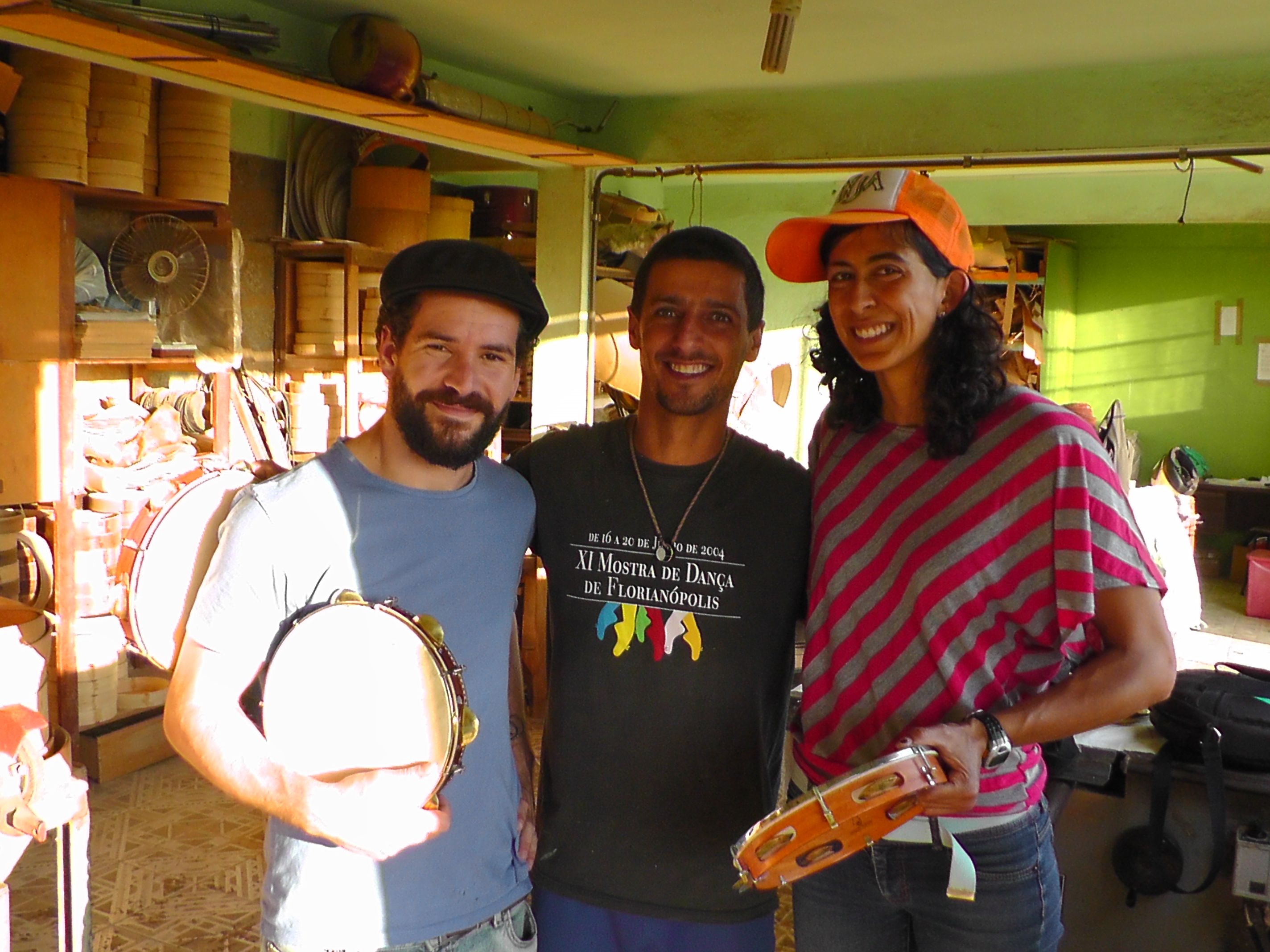 After class my pandeiro teacher, Vava, offered to take my friend and fellow student Dan and I to meet his pandeiro maker, from whom he was picking up an instrument that day. We’ve always admired Vava’s pandeiro, which is made from beautiful dark wood, with an elegant inlaid border, and has such a clear crisp and full sound, it seems to come from a different pandeiro universe than our mortal pandeiros. When he lets one of us play it, it’s like getting to sit down at a Steinway concert grand. Of course we jumped at the chance to meet his pandeiro maker, the master craftsmen, Fabiano Raposa, who happens to live right here in Florianopolis.