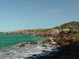 Way in the distance, I could see a giant monolith of stone, almost flush with the water, sticking out into a wild white-capped ocean. It seemed that if I was clever about my route, I could make my way along the boulders lining the steep shore all the way out to