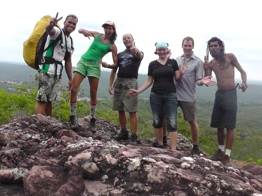 1bteam with lencois in background Published November 25, 2012 at 2848 × 2136 in Climbing waterfalls in Chapada Diamantina! Here’s our brave international team, with Germany, Denmark, the U.S.A. and Brazil all represented. Our awesome guides Marquinhos and Puma are on the ends.